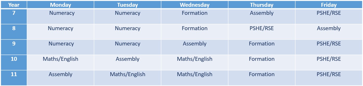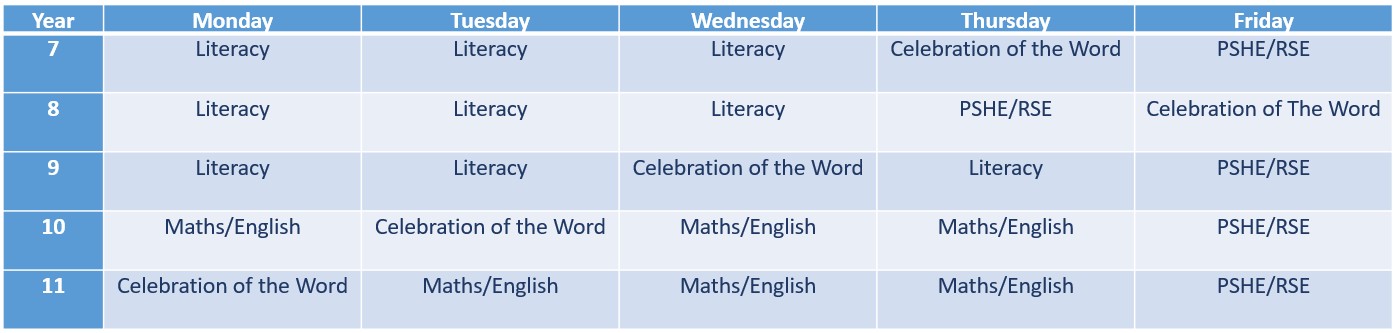 Your child will spend 20 minutes each morning with their form. During this time, pupils will meet with their Form Tutor and take part in planned activities. A daily uniform and equipment check is carried out to ensure the highest of standards are maintained; an act of worship also takes place at this time of the day and your child will have at least one Celebration of the Word assembly over the two week timetable. Each afternoon your child will have a 10 minute registration at the end of the day.